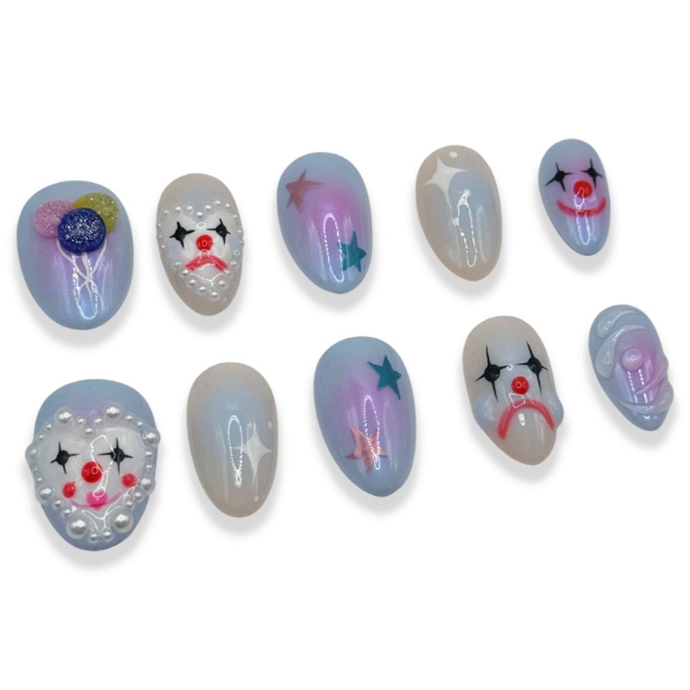 Whimsical pink and blue aura clown nails with 3D balloon accent, playful stars, and glossy finishes - fun, bold, and delightfully quirky.