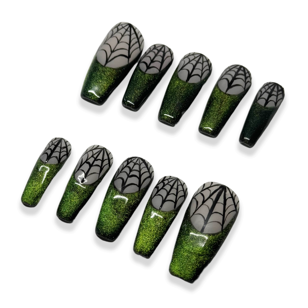 Green cat’s eye French tips with delicate spider web accents at the base - mysterious, edgy, and perfectly bewitching.